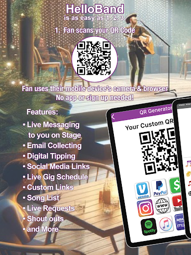 Fans can scan your QR code, press the Say Hello button and notice you instantly on stage! They can say hello, request a song from your in-app songlist, ask for a birthday shout-out, or even just tell you how cool you are. No need to advertise your cell number for texting, or advertising your email address for messaging. No need to promote a social media messaging app, that is tracking your each detail. Our HelloBand Say hello feature is a direct-to-you private notice that you get instantly on your device that you have on-stage.